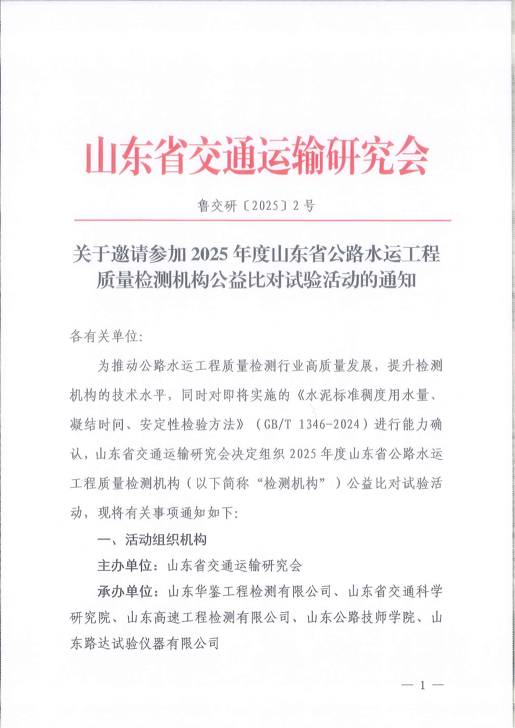 關(guān)于邀請參加2025年度山東省公路水運(yùn)工程質(zhì)量檢測機(jī)構(gòu)公益比對試驗(yàn)活動(dòng)的通知